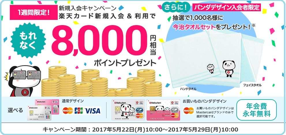 現在、ハピタス経由で楽天カードに申込むと10,000円相当の報酬がもらえる案件が出ています。さらに楽天では現在「楽天カードキャンペーン」実施中(明日5/29まで)。